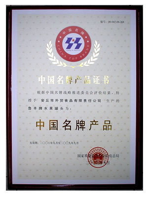 公司生產(chǎn)的"魯豐"牌水果罐頭榮獲"中國名牌"產(chǎn)品!