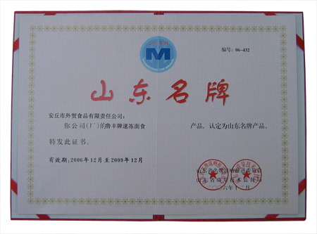 公司生產(chǎn)的"魯豐"牌速凍面食產(chǎn)品榮獲"山東名牌產(chǎn)品"稱(chēng)號!