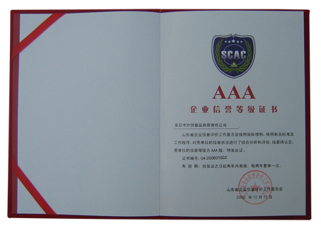 公司被山東省企業(yè)信譽(yù)評價(jià)工作委員會(huì )評為山東省AAA級信譽(yù)企業(yè)